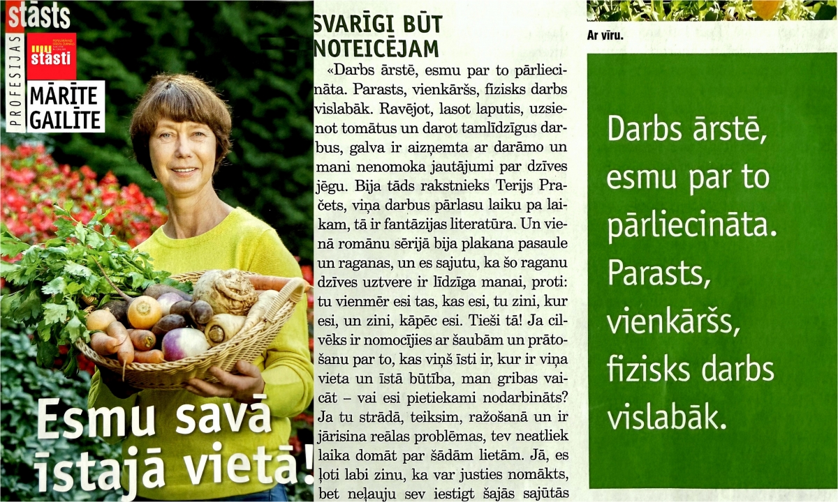Esmu savā īstajā vietā!" Tā par sevi saka agronome un dārzeņkope Mārīte Gailīte. Jau pirms skolas gaitām Mārīte skaidri zinājusi, kur mācīsies un par ko strādās, un par savu vietu dzīvē ne reizes nav šaubījusies. Praktisks optimisms - ar pamatojumu un mērķi. Darbs ārstē, esmu par to pārliecināta. Un nu arī mazmeitiņa. Veiksme un bagātība!